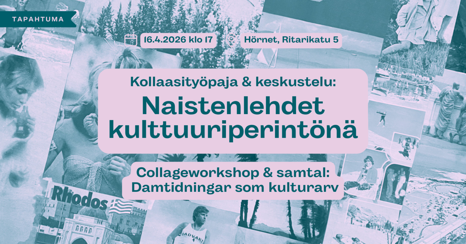 Tutkijat Arja Turunen ja Anne Niiranen keskustelevat osallistujien kanssa muistoista ja kokemuksista liittyen naistenlehtiin. Tutustumme sanomalehtien sisältöön ja luovan uudelleenkäytön mahdollisuuksiin kollaasien avulla. Tarjoamme materiaalit kollaasiaskarteluun ja lisäksi juotavaa sekä pientä purtavaa.