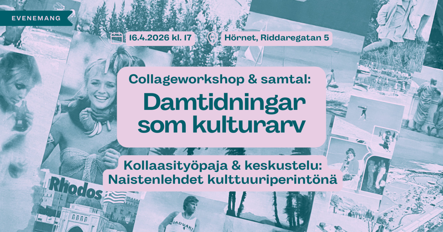 Under denna tvåspråkiga kväll samlas vi kring ett bord fyllt av tidningar från olika decennier. Tillsammans med forskarna Arja Turunen och Anne Niirainen samtalar vi om minnen och erfarenheter av damtidningar. Vi bekantar vi oss med tidningarnas innehåll och möjligheter till kreativt återbruk genom collage. Vi erbjuder material för collagepysslet och bjuder också på dryck och lättare tilltugg.